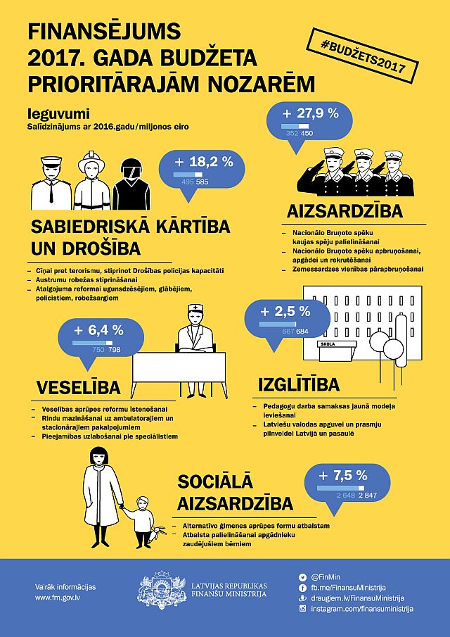 2017. gada valsts budžeta prioritārās nozares ir aizsardzība, sabiedriskā drošība un kārtība, veselība, sociālā aizsardzība un izglītība. Salīdzinot ar 2016. gada budžetu, būtiskākais pieaugums ir aizsardzības nozarei, kurai finansējums palielinājies par 27,9%, tomēr ikvienā no 2017. gada budžetā iezīmētajām prioritārajām nozarēm, salīdzinot ar iepriekšējo gadu, finansējums ir pieaudzis, uzsver Finanšu ministrijā.