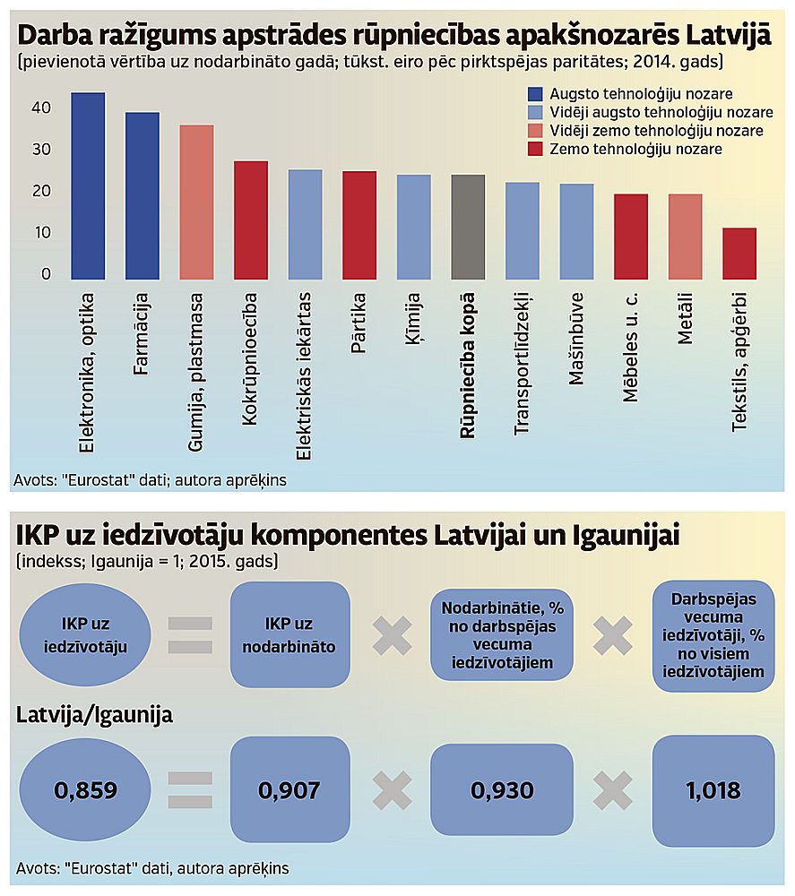 Otrkārt, atsevišķās augsto tehnoloģiju nozarēs darba ražīgums tomēr ir lielāks nekā kokrūpniecībā, piemēram, farmācijā, kā arī datoru, elektronisko un optisko iekārtu ražošanā. Darba ražīgums farmācijas nozarē Latvijā daudz atpaliek no ES vidējā rādītāja, tomēr eiro jeb naudas izteiksmē tas ir ievērojami augstāks nekā vairumā citu nozaru.