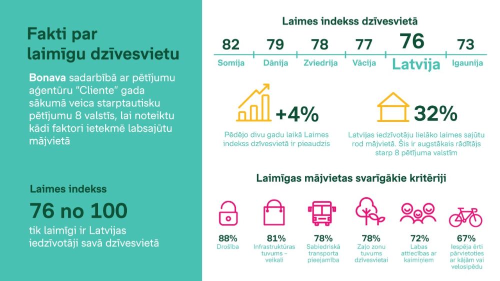 Tas noskaidrots apjomīgā nekustamā īpašuma attīstītāja “Bonava” un pētījumu aģentūras “Cliente” starptautiskā pētījumā, aptaujājot 8582 iedzīvotājus astoņās Ziemeļvalstīs, tostarp Latvijā.