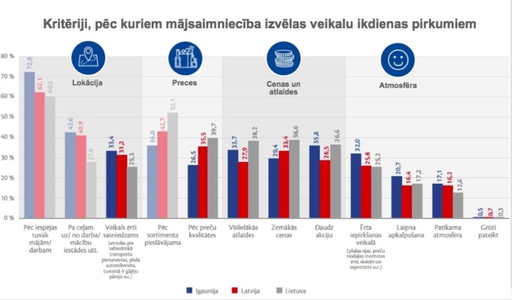 Balstoties uz mazumtirdzniecības pētījuma datiem, var secināt, ka Latvijā un Igaunijā iedzīvotāji biežāk izvēlas veikalu tieši pēc ērtas un pieejamas atrašanās vietas, bet Lietuvā lielāka uzmanība tiek pievērsta piedāvātajam preču sortimentam un kvalitātei, kā arī atlaidēm, savukārt Latvijā un Igaunijā sortiments vairāk svarīgs iedzīvotājiem ar augstākiem ienākumiem. Turpretī Lietuvā preču sortiments ir svarīgs iedzīvotājiem visās ienākumu grupās.