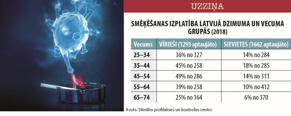 Slimību profilakses un kontroles centra sabiedrības veselības analītiķe Una Mārtiņsone atklāj, ka Covid-19 vēl ir pārāk jauns vīruss, lai par smēķēšanas ietekmi būtu neapgāžami fakti, bet tomēr – tiek pieņemts, ka smēķēšana ir saistīta ar negatīvu slimības gaitas attīstību, pamatojoties uz esošajiem pierādījumiem, kas apliecina tabakas izstrādājumu lietošanas negatīvo ietekmi uz plaušu veselību un respiratoro slimību attīstību: “Ņemot vērā to, ka smēķēšana nomāc imūnsistēmu un tās atbildes reakciju uz infekcijas slimībām, smēķētāji ir pakļauti biežākām saslimšanām ar infekcijas slimībām, tostarp dažādiem sezonāliem vīrusiem.