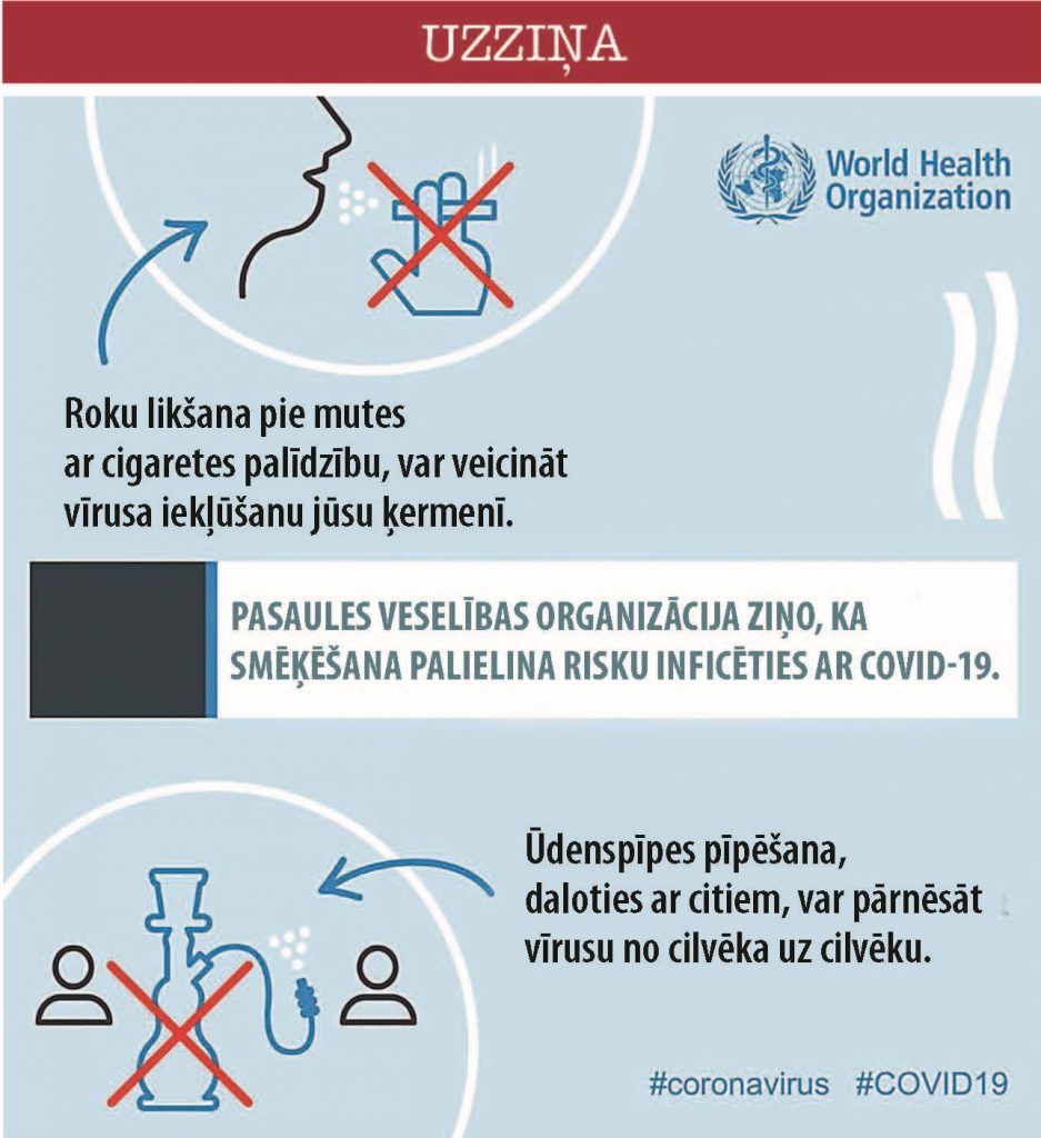 Anda Ķīvīte-Urtāne uzsver: kaut arī vīruss ir pārāk jauns, lai atbilde būtu viennozīmīga, viens ir skaidrs – smēķētāji ir vairāk pakļauti riskam inficēties ar COVID-19 infekcijas izraisītāju, jo, piemēram, smēķējot pirksti, kuri, iespējams, ir bijuši saskarē ar vīrusu (ja pirms tam apmeklēts veikals, bijusi pieskaršanās auto stūrei vai citiem priekšmetiem, bijusi sarokošanās ar citu cilvēku utt.), tālāk saskaras ar cigaretes galu, kas tiek ievietots mutē, tāpat notiek pieskaršanās ar pirkstiem lūpām, sejai.