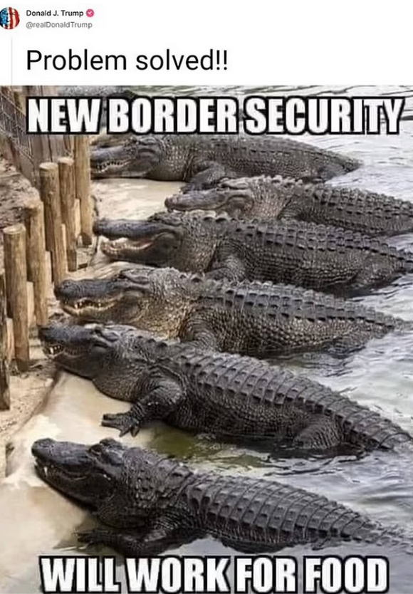 Bijušais prezidents Donalds Tramps trešdien izvirzīja jaunu plānu robežkrīzes risināšanai: izbarot migrantus aligatoriem. Viņš sociālajos tīklos dalījies ar mīmu, kurā redzams sešu aligatoru attēls, uz kura rakstīts “jauna robežu drošība” un “darbosies pārtikai”.
