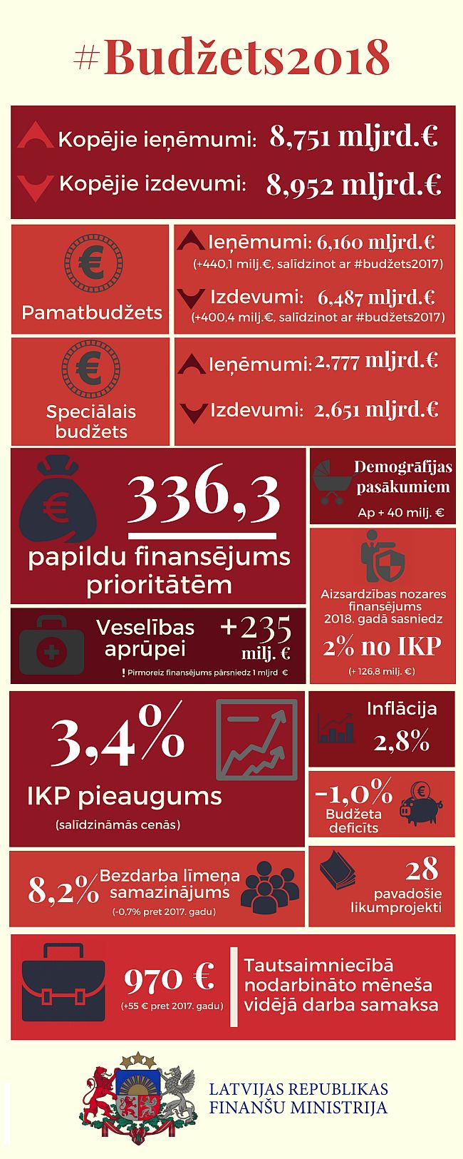 Valsts pamatbudžeta ieņēmumi 2018.gadā prognozēti 6,16 miljardu eiro, bet izdevumi – 6,49 miljardu eiro apmērā. Valsts pamatbudžeta izdevumu palielinājums, salīdzinot ar 2017.gada plānu, ir 400,4 miljoni eiro jeb 6,6%. Izdevumu palielinājums 478,8 miljonu eiro apmērā paredzēts izdevumiem valsts pamatfunkciju finansēšanai, tajā skaitā 438 miljoni eiro uzturēšanas izdevumiem un 40,8 miljoni eiro kapitālajiem izdevumiem.